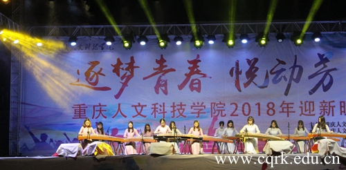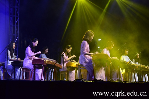 2015级舞蹈学专业学生带来的傣族舞《山灵》甚是精彩,她们优美的舞姿,轻快的步伐,充分展现傣族同胞的热情好客和淳朴民风;由文斐庆、徐吟秋等人带来的古筝齐奏《凉凉》,古典意味浓郁,优美动听,惊艳全场;艺术学院青年教师杨娜一曲《不忘初心》,高昂自信,唱出对祖国的热爱,对学生的期许;教官们的舞蹈《芳华绝代》,更是呼声极高,轻松欢快的舞步,传达了不服输、不惧难、勇敢追求、不负韶华的精神气质,将晚会的热烈气氛推向高潮。