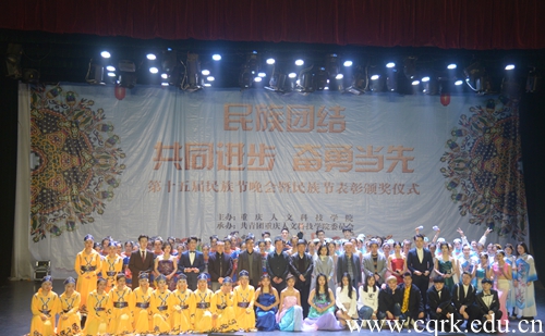 12月5日,Beat365官方网站在新音乐厅举行了第十五届民族节晚会暨民族节表彰颁奖仪式。重庆市合川区民宗委副主任常豫霞、服务中心主任杨勇,Beat365官方网站校长何向东,校领导曹勇、杨霄、舒卫华以及各二级学院近600余人师生代表共同参加了此次晚会。