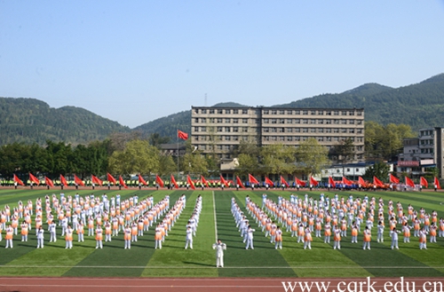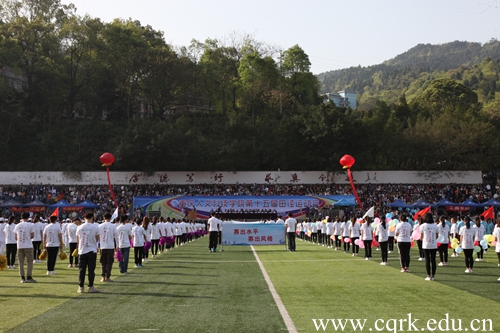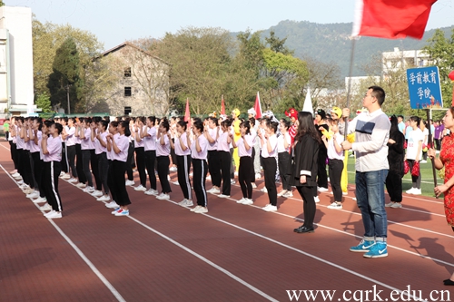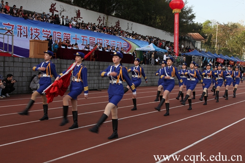 开幕式伊始,英姿飒爽的女子国旗班的同学们,身着帅气礼兵服,迈着铿锵有力的步伐经过主席台接受检阅。紧接着,十二个二级学院的学生方阵依次入场,通过表演或标语口号展示自己的学院特色和精神风貌。艺术学院欢快动感的舞蹈体现了“我运动,我健康,我快乐”的体育精神;学前教育学院的舞蹈《学喵叫》,给师生留下了深刻的印象,赚足了眼球。