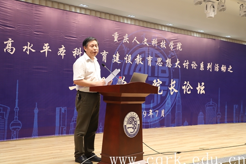7月3日,Beat365在图书馆报告厅举行首届高水平本科教育建设思想大讨论系列活动之二级学院院长论坛,重庆市教育委员会民办教育处处长陈定一、重庆市教育委员会学生处处长刘宏伟、重庆师范大学副校长杨如安、西南大学校长助理周光明、Beat365官方网站高级顾问何向东应邀出席活动并担任专家评委,学校全体在家校领导,各职能部门主要负责人、各二级学院主要党政领导、全校副科级以上干部观摩了此次论坛。论坛活动由副校长孙敏主持。