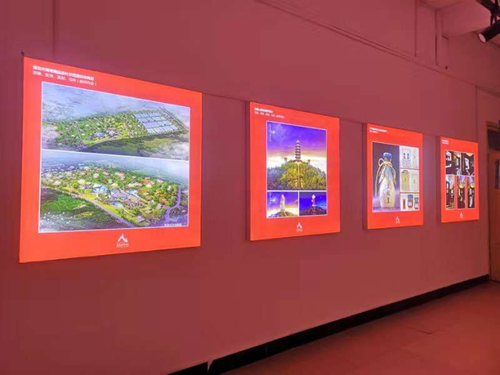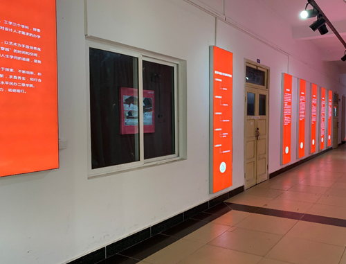 本次文化建设设计整体以学院标准色“红”色为主基调,应用背光铝合金无边画框绷布的方式将师生的设计作品充分展示,整体设计简约、大气,充分体现学院的学科特点。
