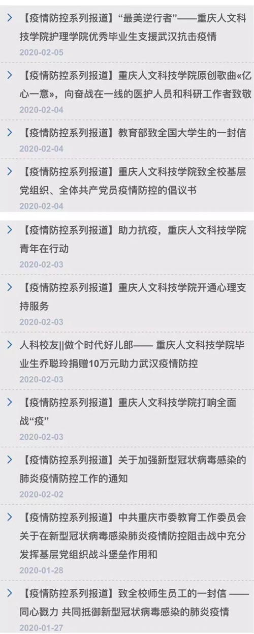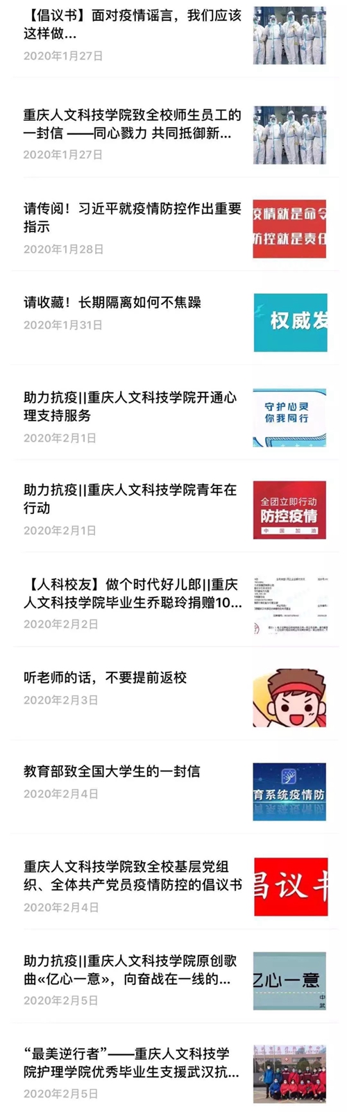 1月27日以来,党委宣传部在校园网、官方微信公众号发布了《致全校师生员工的一封信----同心戮力 共同抵御新型冠状病毒感染的肺炎疫情》《请收藏!这里有新型冠状病毒防控知识》《【倡议书】面对疫情谣言,我们应该这样做》《请收藏!长期隔离如何不焦躁》《听老师的话,不要提前返校》《致全校基层党组织、全体共产党员疫情防控的倡议书》《中共Beat365官方网站委员会转发中共重庆市教育委员会关于在新型冠状病毒感染肺炎疫情防控阻击战中充分发挥基层党组织战斗堡垒作用和党员先锋模范作用的通知》《关于加强新型冠状病毒感染的肺炎疫情防控工作的通知》等,面向全体师生宣传普及疫情防治和防控要求,引导理性认识、科学防控疫情。