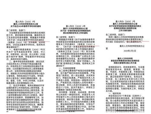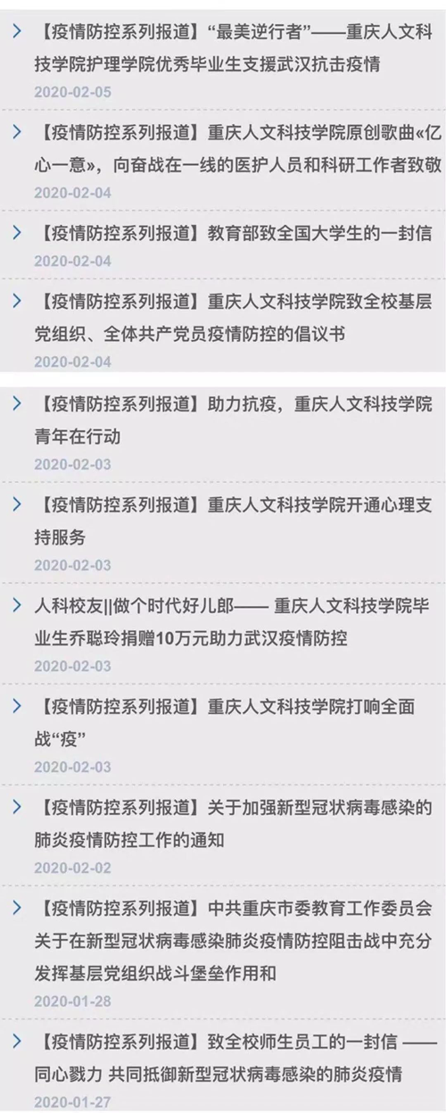 一是严格落实值班值守。班子主要领导坚持假期住校办公,疫情防控小组相关负责人取消休假,值班领导24小时在线在岗带班,值班人员24小时在岗值班,确保上级文件及时接受和处理、疫情信息排查准确无误报送、人员进入校园严格检测体温并做好登记。二是全力管控防范严。实施校园封闭式管理措施,暂停校园场地对外开放,统一学校进出通道,关闭其余校门出入口,预留应急通道。发布校园疫情防控通告,疫情期间不举办大型集会活动,不安排到校集中学习。落实校园出入管理制度,做好逐一登记与体温检测,查验外来人员身份,严禁湖北及外地车辆入校,组织巡逻保安定时开展校园疫情巡查,坚决封堵校外输入性疫情传播蔓延。人文医院特别设立发热门诊,对医务人员开展病毒防范线上培训;开展校园集中消毒工作,制定每月常规消毒方案,定时对教学楼、图书馆、宿舍等公共场所消毒,全方位改善学校内部环境卫生条件。三是全面排查信息准。学校各部门均安排专人负责本部门教职员工疫情情况统计,严格执行零报告和日报告制度,疫情排查,信息统计全面到位。摸排师生寒假出行情况,组织填报《寒假期间教职工基本情况统计表》《近期到武汉或与武汉返渝人员接触人员排查详细信息台账(时间倒推14日)》等表格,认真核实1月10日以来到过湖北及武汉师生情况,动态掌握师生当前所在地、健康及体温状况,做到情况清、底数明、数字准;实行返校报告制度,第一时间告知师生教育部及市防控办返渝工作指示,多次强调学校“三不得”要求,不得提前返校、不得在学校周边住宿、疫区师生开学前不得返回重庆境内;与合川区及草街街道疫情防控部门加强联动,及时掌握学生提前返渝返校信息,劝导并协助提前返校学生安全返回家中。摸排假期在校4类人员情况,逐一核实登记造册,每日报告个人健康状况,严格组织专人核查核实,严防虚报、瞒报、谎报。截止目前,先后摸排校内外师生人员24101人次,筛查学校湖北籍学生183人(该部分学生情况良好,无异常状况),掌握提前返校学生信息2条,劝返来校学生安全返家2人,确保师生摸排工作落细落实落地。