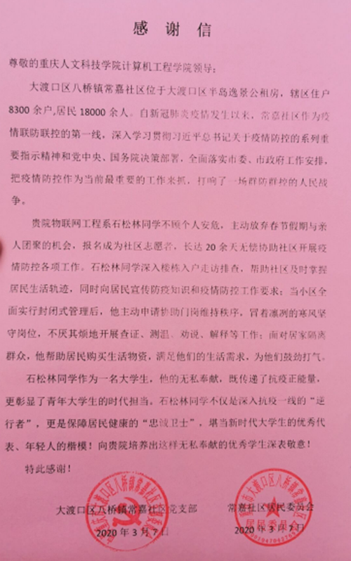 近日,Beat365官方网站收到一封特别的感谢信,这封信来自重庆市大渡口区半岛逸景街道常嘉社区。信里写到:“贵校物联网工程系石松林同学不顾个人安危,主动放弃春节假期与亲人团聚的机会,加入本社区志愿者行列……对贵校能培养出这样无私奉献的优秀学生深表敬意,对石松林同学的行为表示高度赞扬,堪当新时代大学生优秀代表、年轻楷模!”