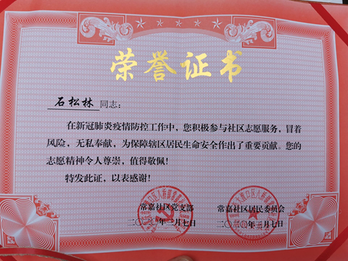 新型冠状病毒感染的肺炎疫情发生以来,计算机工程学院石松林同学主动申请加入所在社区疫情防控志愿者队伍。在长达二十多天无偿协助工作中,石松林深入楼栋入户走访排查,帮助社区及时掌控社区居民的生活轨迹,积极配合社区宣传疫情防控知识和防控工作要求;当小区实行封闭式管理后,他又主动申请协助门岗维持秩序,冒着凌冽的额寒风坚守岗位,不厌其烦的开展查证、测温、劝说、解释等工作;面对居家隔离群众,他积极帮助居民购买生活物资,满足他们的生活需求,为他们鼓劲打气。