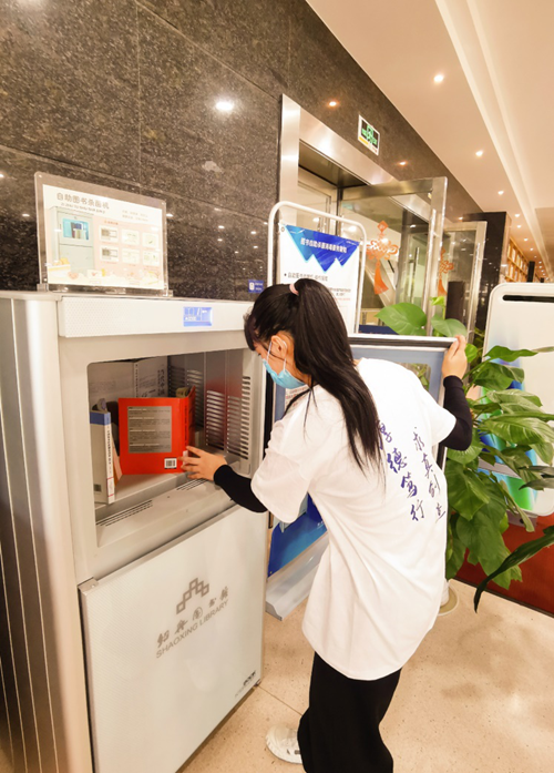图为两名组员正在进行图书馆书籍整理摆放志愿工作