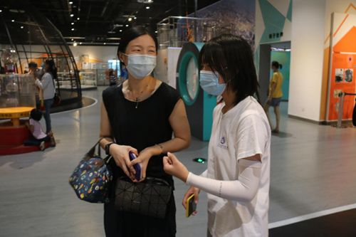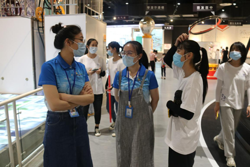 图为科技馆内的志愿者为组员介绍科技馆内的设施和体验项目