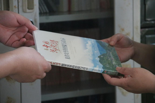 图为组员向农家书屋捐献脱贫攻坚相关书籍。