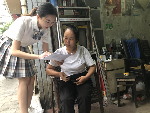 图为曾美多(左一)与当地居民交谈并填写问卷