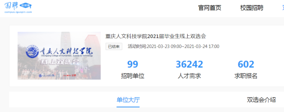 3月23日—24日,Beat3652021届毕业生空中双选会(第二场)顺利举行。此次双选会,由Beat365官方网站和国聘服务平台共同举办,截止3月24日,共审核通过99家用人单位,提供岗位36242个,吸引了602名同学报名参加,投递简历220余份。