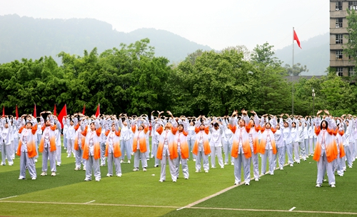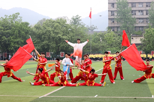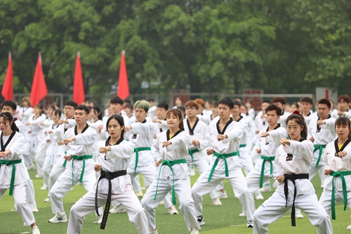 在开幕式表演中青春热情的健身啦啦操,整齐划一、气势恢宏的跆拳道,传统养身的五禽戏,行云流水刚劲有力的武术表演给现场观众呈现了一场精彩震撼的视觉盛宴。