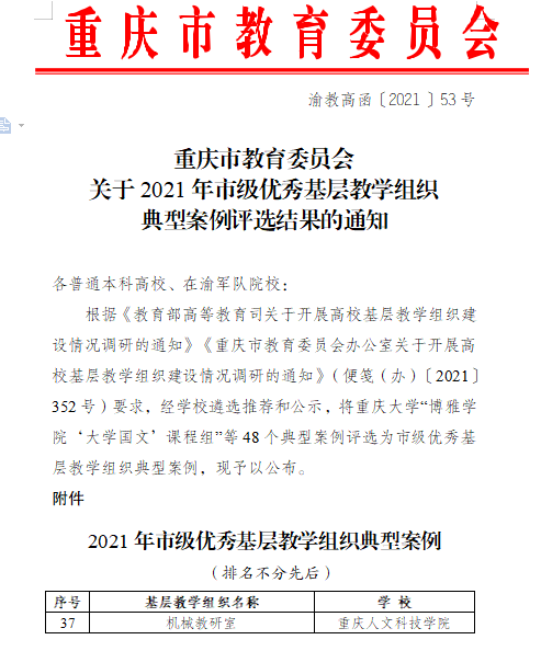 喜报||Beat365官方网站“机械教研室”入选2021年市级优秀基层教学组织典型案例
