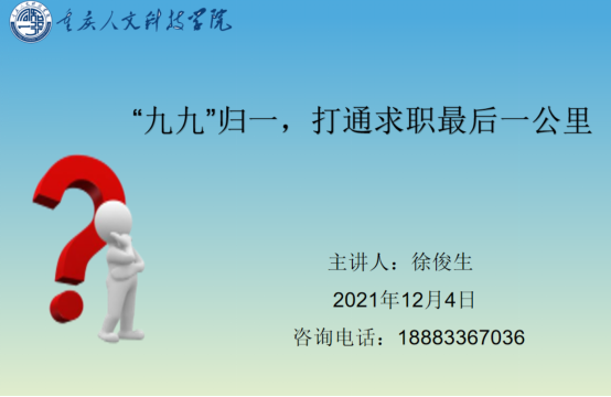 求职行动“下篇”—《“九九”归一,打通求职最后一公里》,由学前教育学院辅导员徐俊生主讲。徐俊生从9个方面以流程化的方式讲述了面试前准备,面试中技巧,面试后收尾会遇到的常见问题。并传授学生在面对HR推断你的为人、判断胜任能力、观察职业素养、了解职业规划、试探新资期望的对话中如何见招拆招。