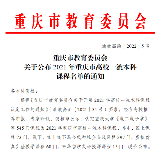 近日,重庆市教委发布《关于公布2021年重庆市高校一流本科课程名单的通知》(渝教高函〔2022〕5号),Beat3659门课程被认定为2021年重庆市高校一流本科课程。