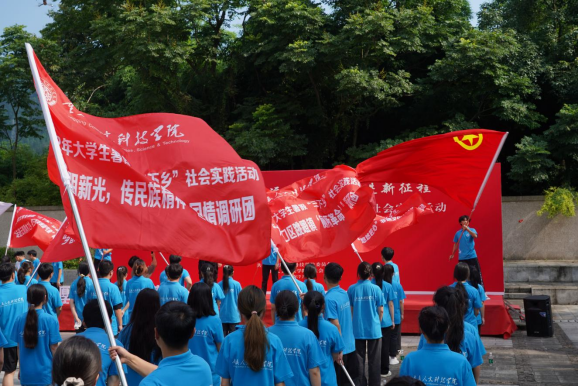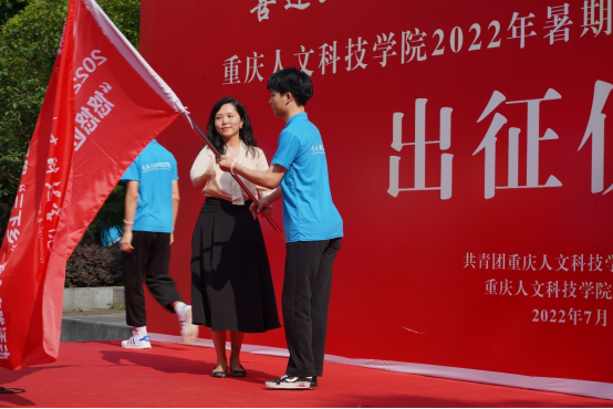 随后,舒卫华、吴静分别为“探索振兴之路,实践助力恒合”实践团、“芯声”大学生直播带货人才培养基地实践团、“悠悠匠心”非遗文化传承实践团、“国情携乡情,情情入人心”实践团、“走进云阳清水之乡,寻三农发展新气象”返乡实地调研团等5个市级重点实践团队授旗,一面面飘动着的红旗,寄托着老师们的厚望与祝福,同时满怀着对同学们暑期“三下乡”社会实践活动的期待,希望他们能通过本次实践活动,走进乡村、了解国情,更加清晰的认识到国家发展成绩的来之不易,进一步明确作为时代新人、青年学子应该肩负的使命与担当。