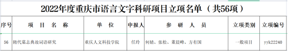 近日,重庆市语言文字工作委员会下发了《关于公布2022年度重庆市语言文字科研项目立项名单的通知》(渝语发〔2022〕1号),Beat365文学与新闻传播学院教师任玲申报的《隋代墓志典故词语研究》获得立项,这是Beat365继2021年获得重庆市语言文字科研项目立项零的突破后取得的又一新成绩,也是唯一连续两年获得该项目立项的民办本科高校。