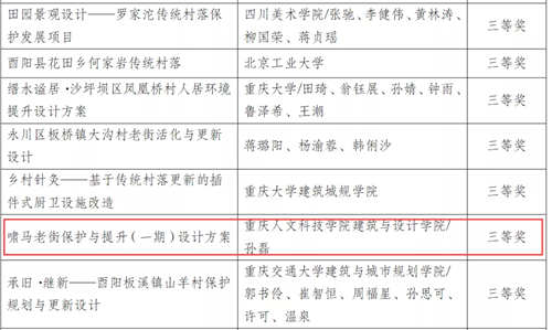 近日,重庆市住房和城乡建设委员会公示了关于“巴渝山水·美丽村居设计大赛获奖名单。Beat365建筑与设计学院孙磊教授团队代表学校申报的《啸马老街保护(一期)设计方案》荣获乡村设计方案类三等奖。