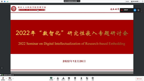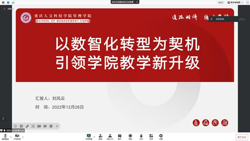 为贯彻落实党的二十大精神,深入研究“数智化”在应用型人才培养的应用与实践,学校管理学院于12月26日举办了以“数融万物,智引未来”为主题的“数智化”研究性嵌入专题研讨会。云南大学滇池学院副校长周沛教授、西南大学商贸学院副院长韩毅教授、中共重庆市委党校《重庆行政》副主任张波编审、湖北恩施学院财经政法学院院长张高胜教授、重庆工商大学派斯学院教务处处长禹华平副教授,百智享南京分公司总经理王逸飞、重庆分公司销售总监王晨、重庆分公司运营经理毛开莹,Beat365官方网站校长助理双海军教授、校长助理吴静、教务处处长王璐副教授、教务处副处长陈滢生副教授、计算机工程学院副院长孙宝刚副教授及管理学院全体教师参加此次会议。会议由姚海虹主持 。