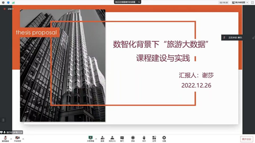谢莎老师借助“数智化”和旅游大数据为研究背景对数智化背景下《旅游大数据》课程建设与实践进行了汇报,她以《旅游大数据》国内外研究现状以及研究意义为切入点,点明《旅游大数据》课程主要是培养学生的数据分析能力和思维,重点在于如何运用“旅游大数据”进行课程建设,讲解了如何运用现有研究来建设和如何进行有效的实践、反馈、验证和修改。