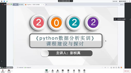 彭桢真老师就《python》数据分析实训课程建设与探讨展开汇报,她介绍了该课程以国家创新驱动战略实施为开设背景,课程设计立足行业需求,正逐步向数据挖掘和分析等新兴智能化技术靠近。在课程教学方面,她通过课堂教学与课后习题练习,培养学生数据分析的能力和脚本运行能力;针对课程存在的问题以及教学效果的反馈,采取了相应措施积极应对。
