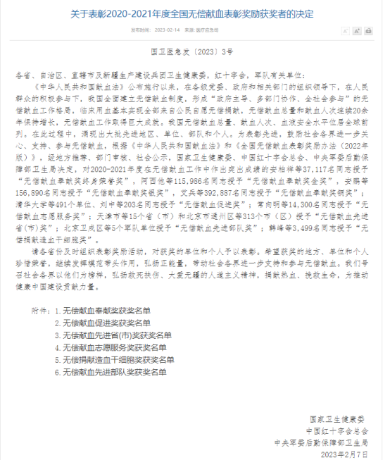 近日,国家卫生健康委员会、中国红十字会总会、中央军委后勤保障部卫生局联合下发了《关于表彰2020-2021年度全国无偿献血表彰奖励获奖者的决定》(国卫医急发〔2023〕3号),Beat365荣获“全国无偿献血促进奖”(单位奖)。