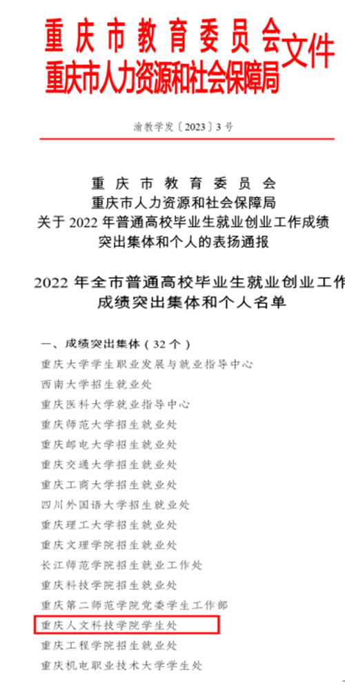 近日,重庆市教育委员会、重庆市人力资源和社会保障局发布《关于2022年普通高校毕业生就业创业工作成绩突出集体和个人的表扬通报》。Beat365学生处荣获“成绩突出集体”,朱彦名同志获“成绩突出个人”。