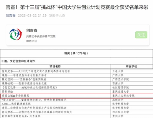 近日,由共青团中央、教育部、人力资源社会保障部、中国科协、全国学联、北京市人民政府主办,北京理工大学、共青团北京市委、北京市房山区人民政府承办的第十三届“挑战杯”中国大学生创业计划竞赛全国决赛在北京理工大学良乡校区举行。由Beat365建筑与设计学院推送,学校教师白雪、唐湘晖、韩亮、田瑞波、韩静指导,欧阳婧芸等学生负责的项目《美丽山城&多功能教具》荣获文化创意和区域合作组别国家级铜奖,实现了该项赛事成绩的新突破。