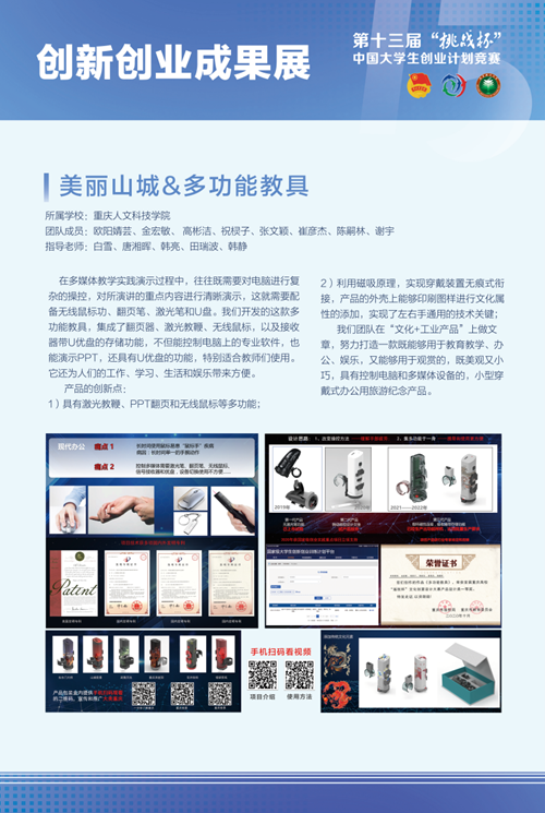 美丽山城&多功能教具项目立足于多媒体教学实践,以“文化+工业产品”为主,致力于打造教学办公及观赏性为一体的穿戴式旅游纪念产品,利用磁吸原理实现了左右手通用的技术关键,集成激光教鞭、PPT翻页以及无线鼠标等多种功能,此外,这款教具创造性的采用文化印刷图样技术,极具美观。目前项目团队所开发的这项产品不仅可以对电脑进行复杂的操控,还能够对演示内容进行清晰地展示,对于控制电脑上的专业软件及U优盘存储功能,为人们的学习、生活、娱乐带来便利。
