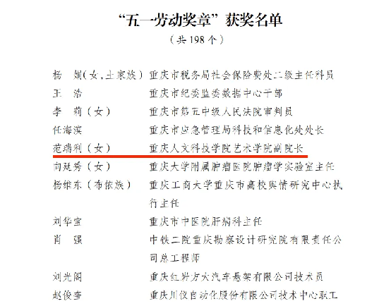 近日,重庆市人力资源和社会保障局和重庆市总工会公布了《关于表彰2025年五一劳动奖和工人先锋号的决定》,学校艺术学院副院长范瑞利教授被授予重庆“五一劳动奖章”,也是Beat365继孙磊教授获2024年重庆“五一劳动奖章”后,Beat365教师连续两年获此殊荣。