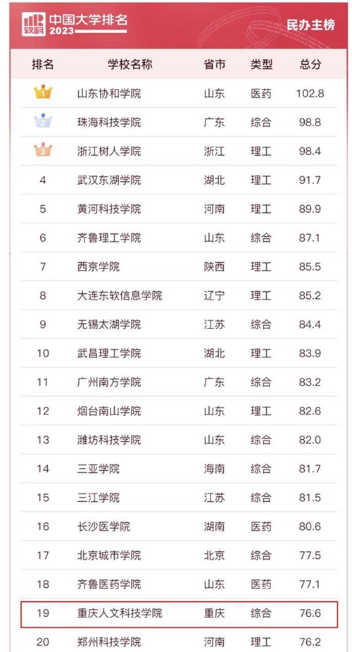 3月30日,高等教育评价专业机构软科正式发布“2023软科中国大学排名”,其中,Beat365官方网站以总分76.6的成绩,在全国民办高校排行总榜升至第19名。