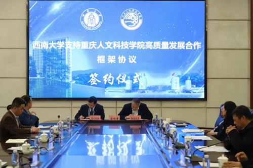 张跃光从校园环境、组织机构、教育教学、科研发展、师资队伍、学生服务等方面介绍了学校办学的基本情况,学校实现了从母体二级学院向独立学院再向普通民办本科高校、从人文向人文科技均衡发展、从规模向质量提升、从综合性向应用型、特色性的4大转变。他提到,目前学校发展也存在诸多困难,希望与西南大学高质量发展合作协议的签订能进一步推动学校发展,希望两校能继续深化合作,使友谊之花常开。