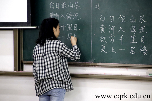 大赛分为硬笔组、粉笔组、毛笔组。首先是硬笔字比赛,参赛选手在规定时间内完成评委老师指定文章《逍遥游》节选。粉笔字组比赛参赛选手依次上台书写由评委抽取的古诗词。毛笔组选手则通过大屏幕展示的图片,立意书写。经过认真评选,龙思岑获硬笔组和毛笔组一等奖,谭钰滢获粉笔组一等奖。