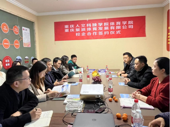 研讨会上,肖宇翔院长介绍了学院的发展历程、师资力量、学科发展、人才培养方案、科研成果等基本情况,阐述了社会体育指导与管理专业的发展优势、专业特性、学生优势及构成等。重庆聚浪体育发展有限公司总经理蒋道明分享了企业的发展历程、企业文化、发展前景、核心产品技术特色等基本情况。随后双方就进一步开展“产-学-研”合作交流问题展开了研讨,学院提出将学院专业特色优势与公司的发展优势结合在一起,在提升学生就业能力的同时增强学生的实践能力,以更好地让学生融于企业和社会;企业就人才入职、招聘条件等方面阐明了需求。双方共同探讨了学生实习实践、就业发展、人才培养、平台共建等方面的潜在合作领域与途径,并达成了长期合作意愿,签订了毕业生就业基地协议。